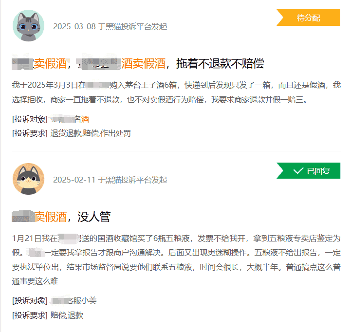 面对这一乱象,消费者在购买名酒时往往心存顾虑,担心买到假货,而一旦遭遇假酒,维权之路也往往困难重重。有的消费者在申请退款时发现商品链接已下架,店铺关闭,难以追溯;有的则需要自行送检,过程繁琐,退货退款更是费时费力。