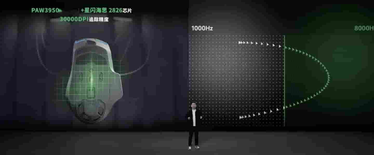 在规格方面,黑鲨星闪冷暖电竞鼠标搭载了高性能的PAW 3950和星闪海思2826芯片,支持有线和无线8KHz回报率,确保了极高的响应速度和稳定性。鼠标还配备了黑曼巴微动,标称续航可达120小时,并且为了方便用户充电,还特别设计了一个磁吸充电底座。