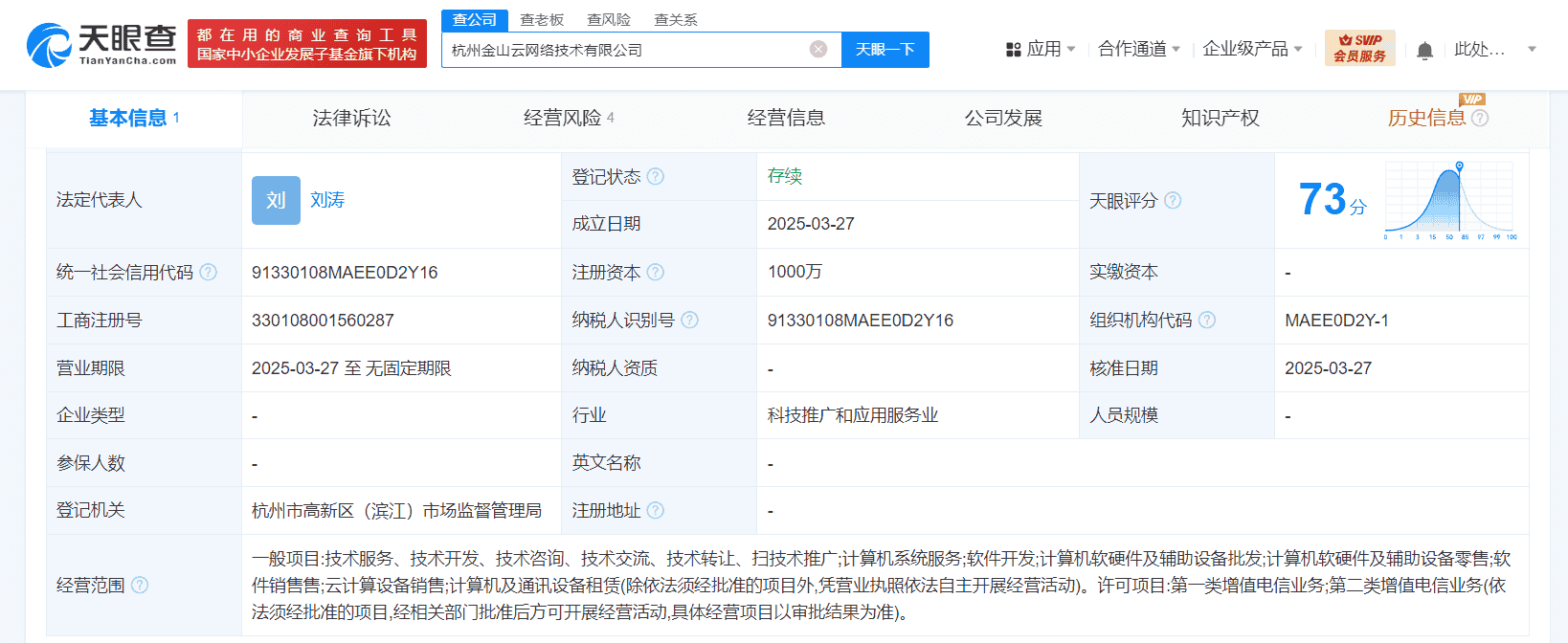 近期,一家名为杭州金山云网络技术有限公司的新企业悄然成立,引发了业界的广泛关注。据天眼查信息显示,该公司的法定代表人为刘涛,注册资本为人民币1000万元,业务范围相当广泛,涵盖了计算机系统服务、软件开发、计算机软硬件及辅助设备的批发与零售、软件销售、云计算设备销售以及计算机和通讯设备的租赁等多个领域。
