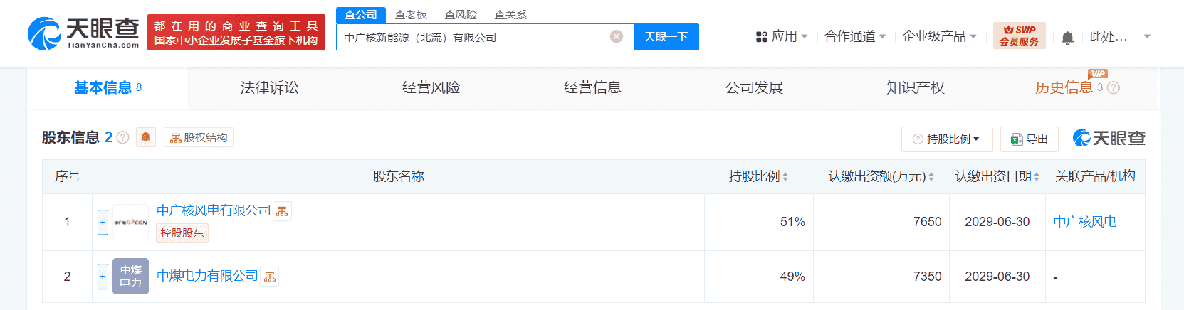 据天眼查信息显示,中广核新能源(北流)有限公司的股东结构颇为引人注目。它由中广核风电有限公司与中国中煤旗下的中煤电力有限公司共同持股,这一强强联合无疑为公司未来的发展奠定了坚实的基础。