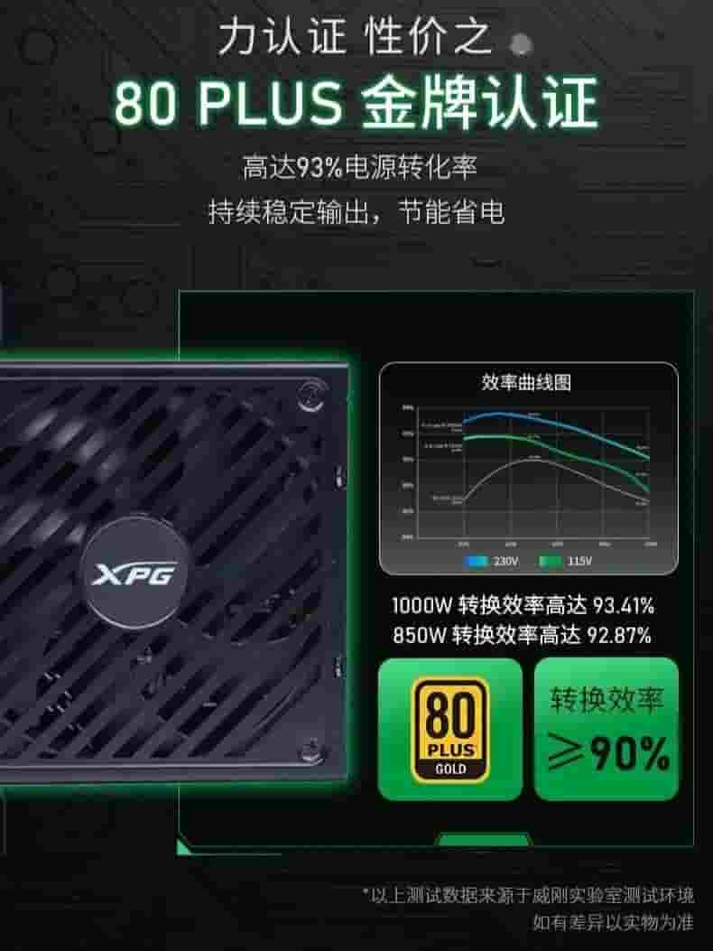 XPG魔核SP电源系列推出了850W和1000W两种功率版本,以满足不同用户的需求。其中,850W版本提供了黑白两种配色选择,峰值转换效率可达92.87%;而1000W版本目前仅提供黑色款式,但其峰值转换效率更高,达到了93.41%。两款产品均获得了80 PLUS金牌认证,体现了其出色的能效表现。