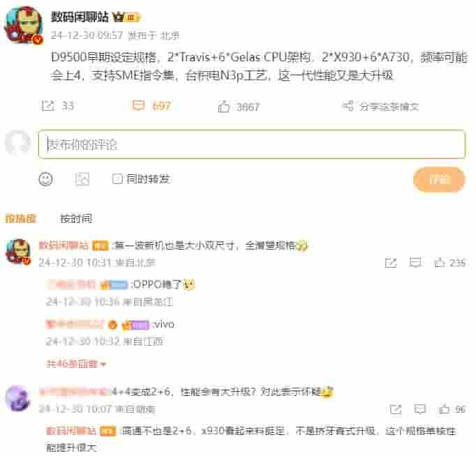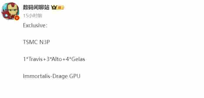 在此前发布的微博中,该博主还透露了天玑9500的早期设定规格。当时,这款芯片被设计为拥有2颗Travis超大核和6颗Gelas大核的CPU架构,搭配2颗X930和6颗A730的组合,频率可能飙升至4GHz。同时,它也支持SME指令集,并采用台积电N3P工艺。这些参数表明,天玑9500在性能上将有大幅度的提升。