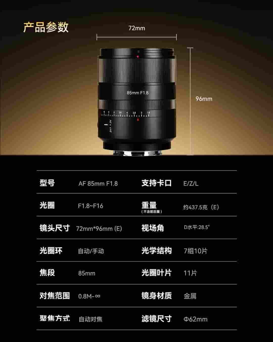 关于镜头的具体参数,光圈范围从F1.8至F16,适用于多种拍摄场景。镜头尺寸为72mm x 96mm(E卡口版本),采用7组10片的光学结构,焦段固定在85mm,适合人像与特写摄影。光圈叶片数量为11片,有助于形成圆润的焦外效果。最近对焦距离为0.8米,滤镜尺寸则为Φ62mm,方便用户搭配各种滤镜使用。