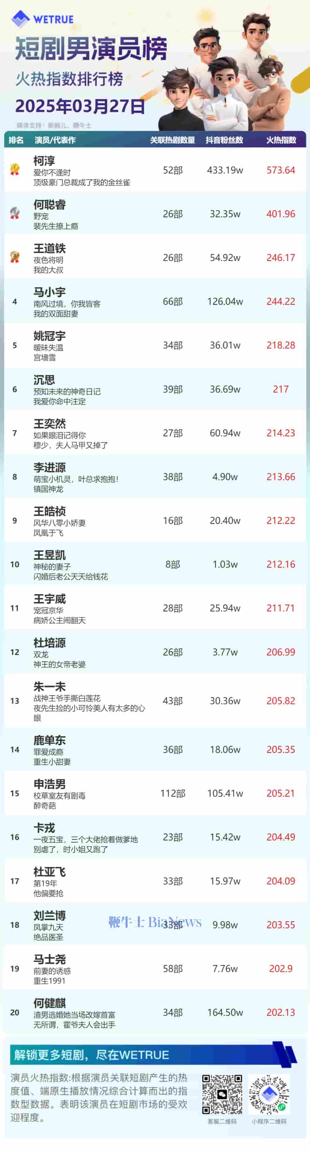3月27日短剧演员热度榜揭晓:刘念、柯淳登顶火热指数冠军