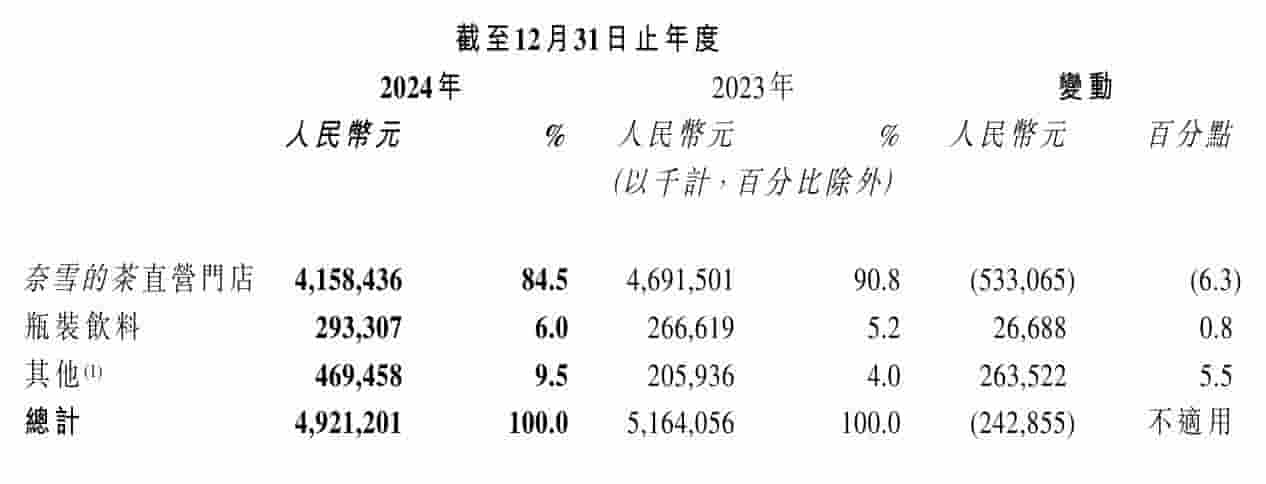 从营收结构来看,奈雪的茶直营门店的收入为41.58亿元,同比下降了6.3%,减少了5.33亿元。而瓶装饮料业务则略有增长,收入为2.93亿元,占整体营收的6%,较上一年的2.66亿元有所提升。其他业务收入达到4.69亿元,占总营收的9.5%。