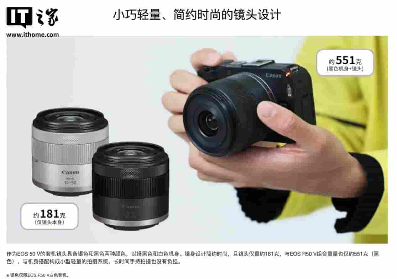 外观设计方面,这款镜头作为EOS R50 V的套机镜头,提供了银色和黑色两种选择。镜头本身重量为181克,与EOS R50 V搭配使用时,黑色套机的总重量为551克。这一轻巧的设计使得用户能够轻松携带并进行长时间拍摄。