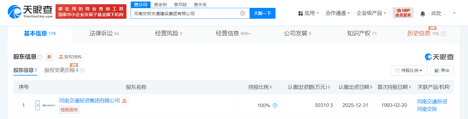 据天眼查进一步揭示,河南交投交通建设集团有限公司的股权结构清晰明了,由河南交通投资集团有限公司全资持有。这一股权结构无疑为公司的稳健发展提供了坚实的后盾。