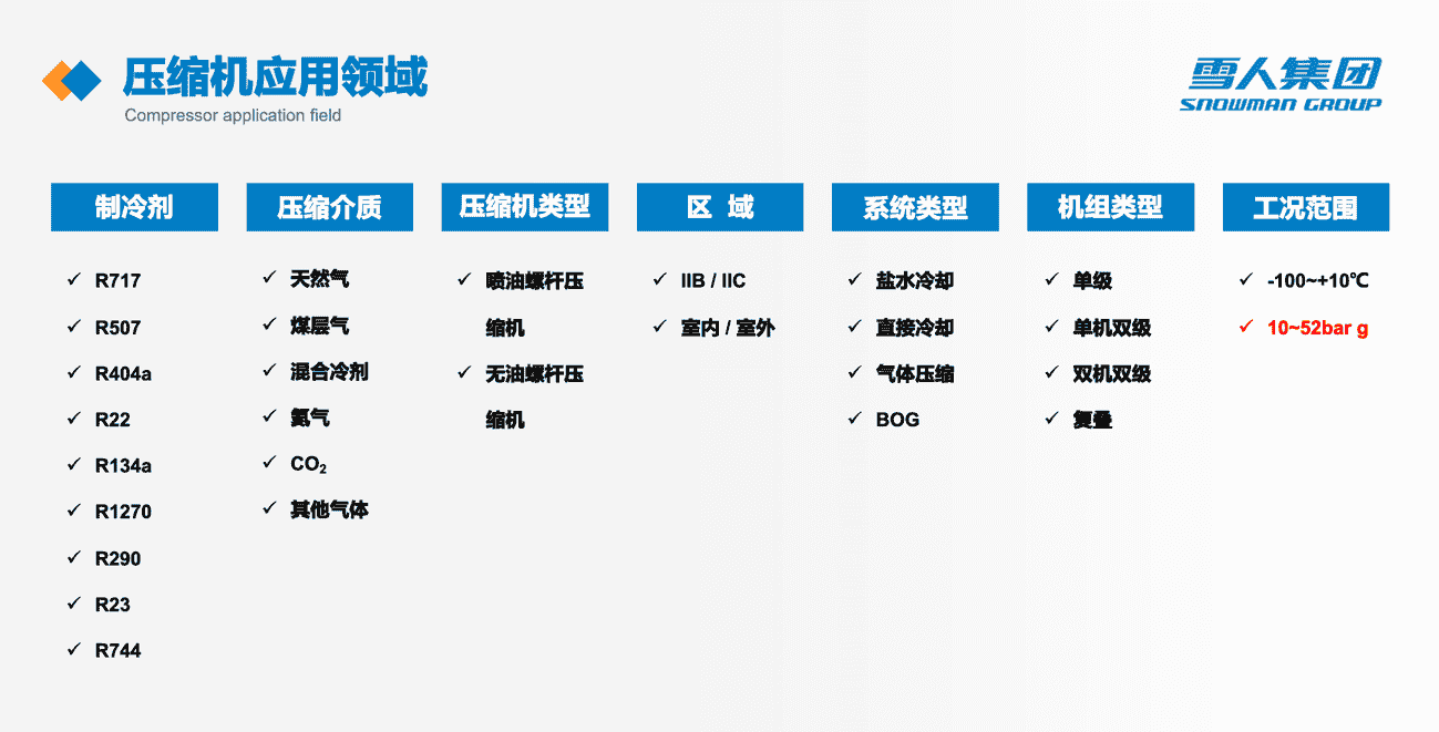 雪人集团依托瑞典SRM压缩机技术,凭借其强大的非标设计能力,为石油化工行业提供了全品类、全介质适配的压缩机组及系统方案。该方案覆盖了多种制冷剂,如R717、R507、R404a、CO₂等,同时兼容天然气、煤层气、BOG、氩气等复杂介质,能够满足从-100℃至+52barg的严苛工况需求。通过模块化设计、智能化控制与全生命周期管理,雪人集团持续优化压缩系统效能,为石油化工领域提供了坚实的技术支撑。