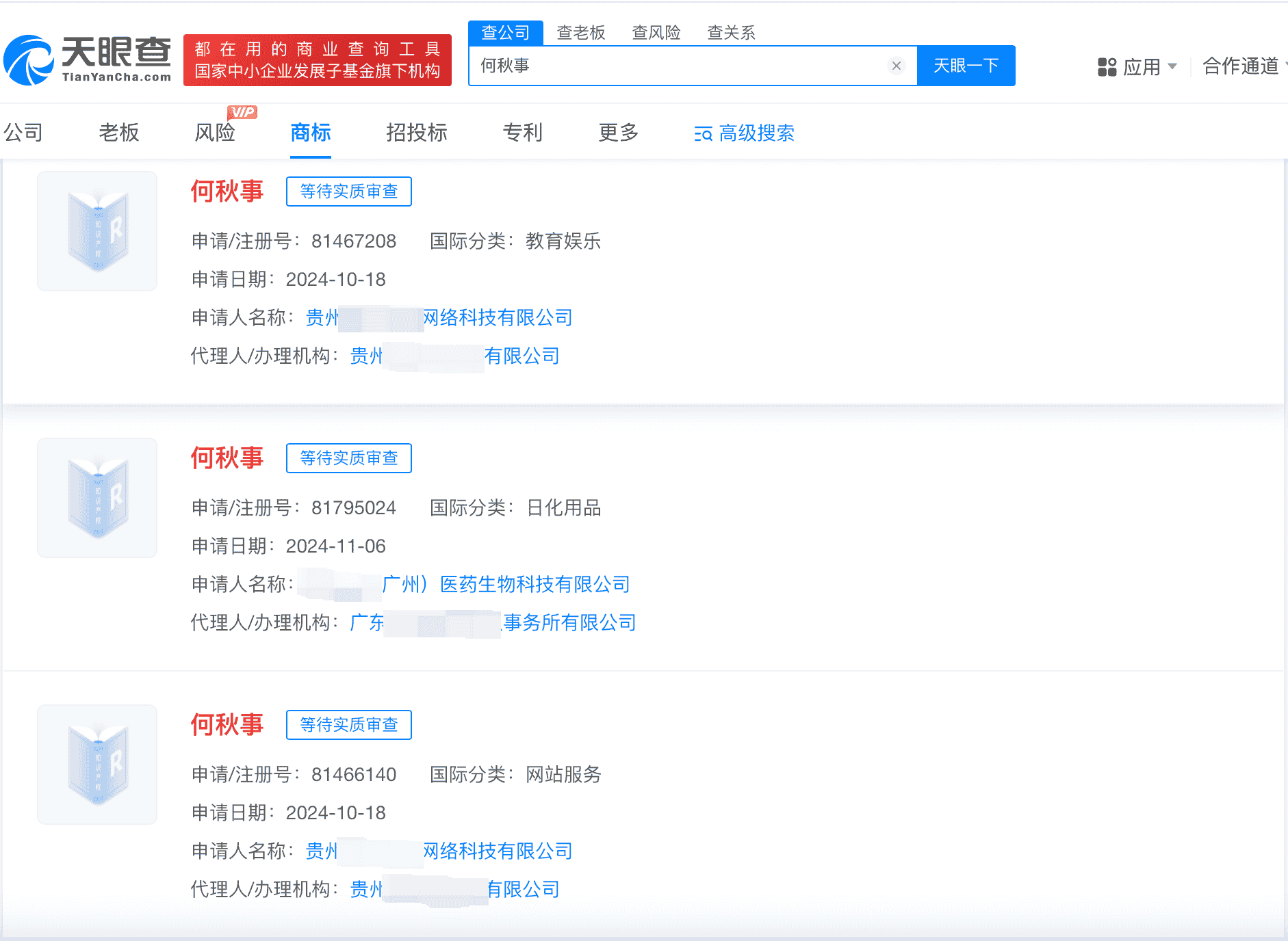 据天眼查信息显示,值得注意的是,“何秋事”这一名称已经被两家公司申请注册为商标。其中一家是贵州的某网络科技公司,另一家则是广州的某医药公司。这些商标的国际分类涵盖了教育娱乐、日化用品以及网站服务等多个领域,目前均处于等待实质审查的阶段。
