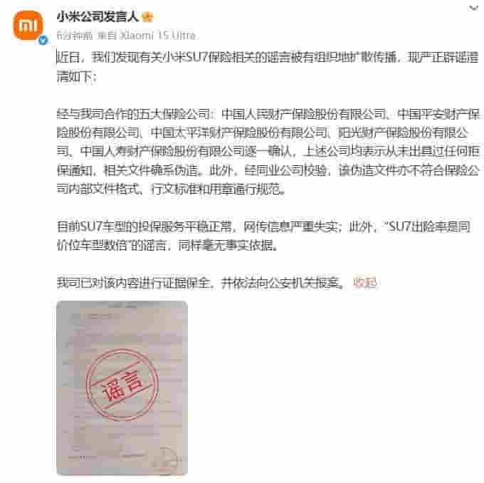 近期,小米公司官方发言人针对网络上流传的小米SU7车型保险相关谣言发表声明,明确指出这些不实信息是有组织地传播。