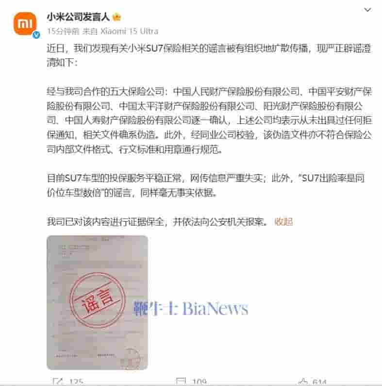 小米公司表示,为澄清事实,已与其合作的五大保险公司,包括中国人民财产保险股份有限公司、中国平安财产保险股份有限公司、中国太平洋财产保险股份有限公司、阳光财产保险股份有限公司、中国人寿财产保险股份有限公司,逐一进行了核实。所有保险公司均明确回复,从未发出过任何关于拒绝为小米SU7车型提供保险服务的通知,相关文件纯属伪造。