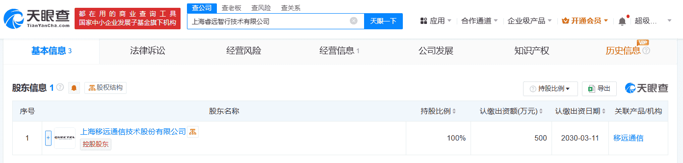据天眼查进一步揭示,上海睿远智行技术有限公司的股权结构清晰明了,由移远通信(股票代码:603236)全资持有。这一背景无疑为公司的未来发展注入了强大的信心和动力,移远通信在通信领域的深厚积淀和技术实力,将为上海睿远智行技术有限公司在智能车载设备及相关技术的研发与市场推广上提供有力的支持。