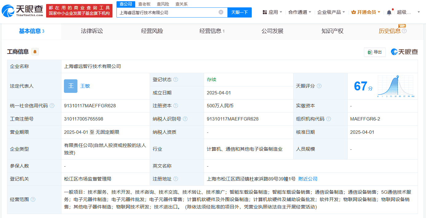 近期,一家专注于智能车载设备及相关技术的新公司——上海睿远智行技术有限公司,已正式宣告成立。据天眼查信息显示,该公司的法定代表人为王敏,注册资本高达500万元人民币,业务范围广泛,涵盖了智能车载设备的制造与销售、5G通信技术服务以及电子元器件的制造等多个领域。