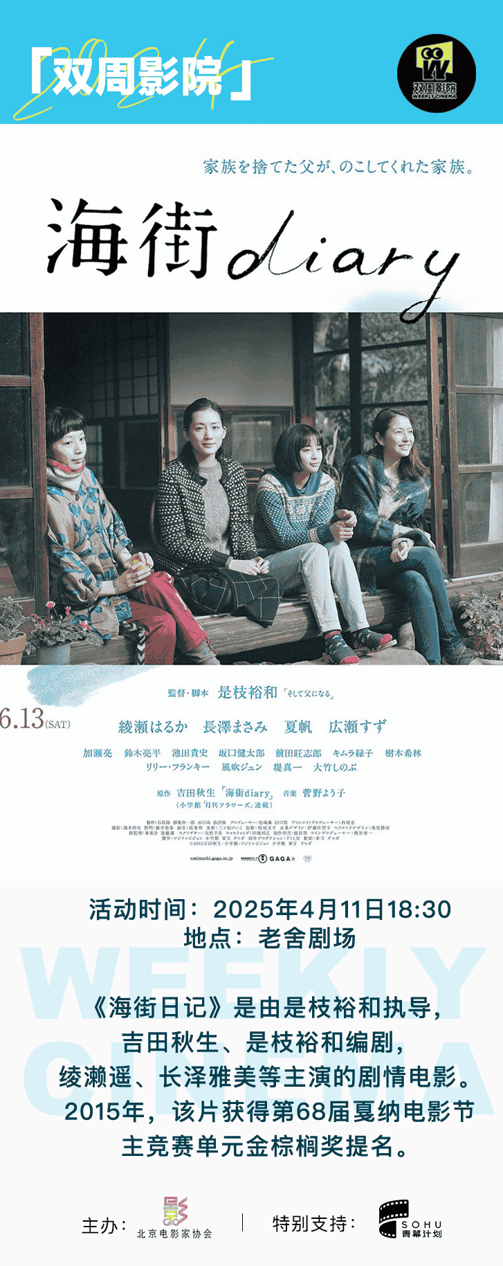 近日,一场备受瞩目的电影放映活动即将在北京老舍剧场拉开帷幕。此次活动由北京电影家协会精心策划,并得到了青幕计划的特别支持,名为“双周影院”的系列活动,将于4月11日18:30为影迷们带来一部经典之作——《海街日记》。