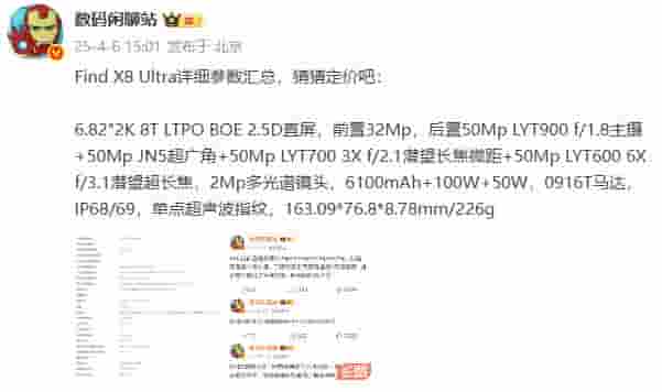 在其他配置上,OPPO Find X8 Ultra同样不容小觑。据爆料,该机预计将搭载高通骁龙8至尊版处理器,配备高达6100mAh的大容量电池,并支持100W有线快充和50W无线快充,续航能力堪称顶级。OPPO Find X8 Ultra还采用了单点超声波指纹、立体声双扬声器以及0916T马达,全方位提升用户体验。其IP68/69级防水功能更是为用户提供了额外的安全保障。