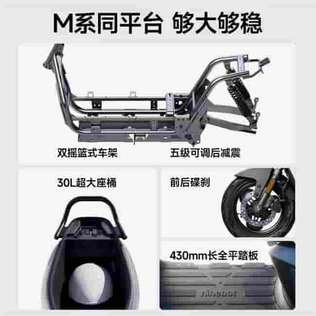此外,九号电动N3 85c配备五级可调式后减震,无论是单人通勤还是载物出行,都能根据需求调整到最舒适的状态。前后双碟刹系统则进一步提升了安全性,刹车灵敏、距离短,让骑行更安心。30L大座桶能轻松容纳全盔或背包,而430mm*380mm全平大踏板设计,不仅脚感舒适,还能放置大件物品,实用性拉满。对于很多人好奇的电动摩托车怎么选这个问题,九号电动N3 85c的扎实底盘和贴心设计无疑给出了一个优质答案。