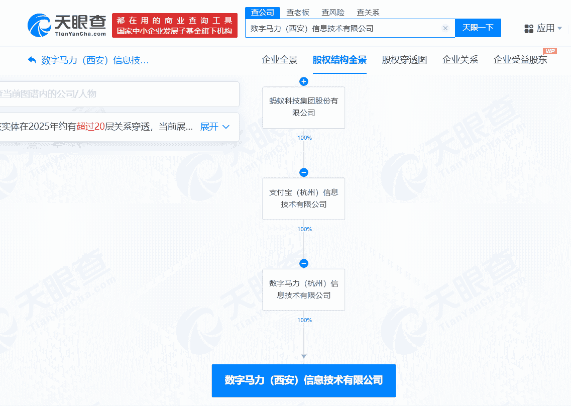 进一步探究其股权结构,我们发现数字马力(西安)信息技术有限公司的背后是数字马力(杭州)信息技术有限公司的全资控股。而更引人关注的是,数字马力(杭州)信息技术有限公司则是由蚂蚁科技集团股份有限公司间接全资持有,这一背景无疑为这家新成立的公司增添了更多的期待与看点。