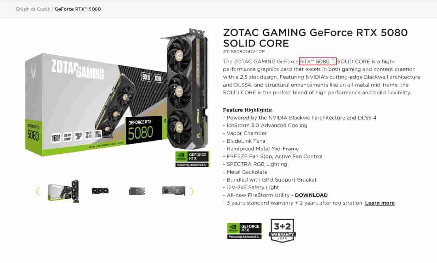 索泰官网泄露RTX 5080 Ti信息?页面已修正引发热议