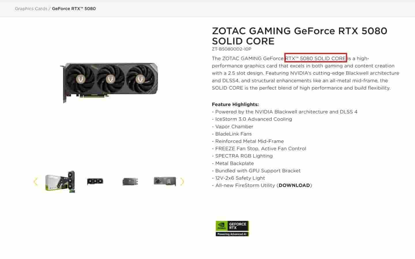 近期,有关索泰显卡的一则消息引起了广泛关注。据外媒VideoCardz的报道,索泰在其官网的部分地区版本中,意外泄露了关于GeForce RTX 5080 Ti显卡的相关信息。这一信息原本不应出现在ZOTAC GAMING GeForce RTX 5080 SOLID CORE显卡的页面上。