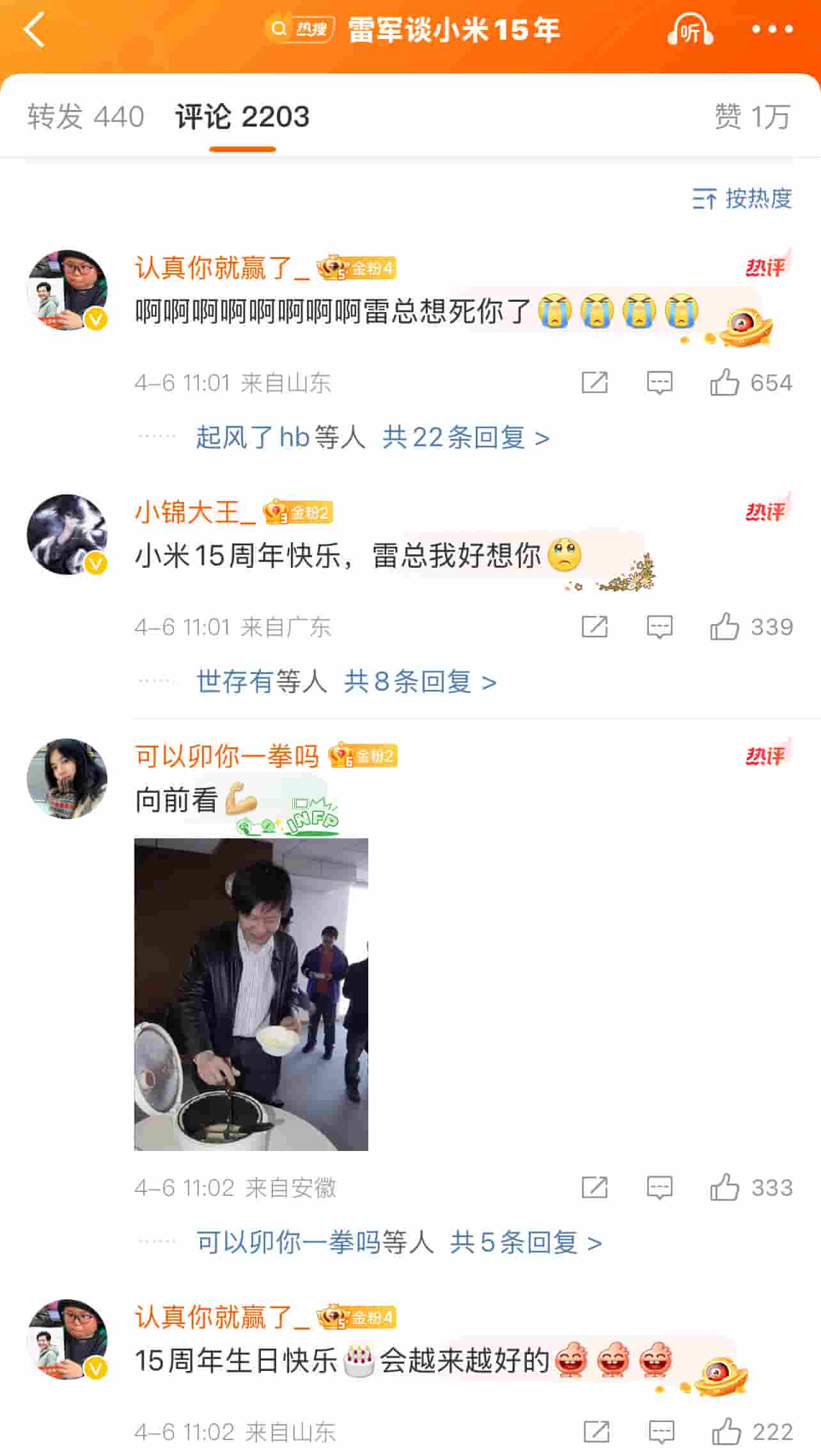 与此同时,小米总裁卢伟冰也在微博上发表了自己的感慨:“十五年前的今天,小米在中关村银谷大厦的一间小小办公室里诞生。上周,我有幸在中欧商学院,向学校的师生们分享了小米的成长故事和未来的蓝图。创业之路,既是对梦想的追求,也是对自我的磨砺。我们将继续携手前行。”