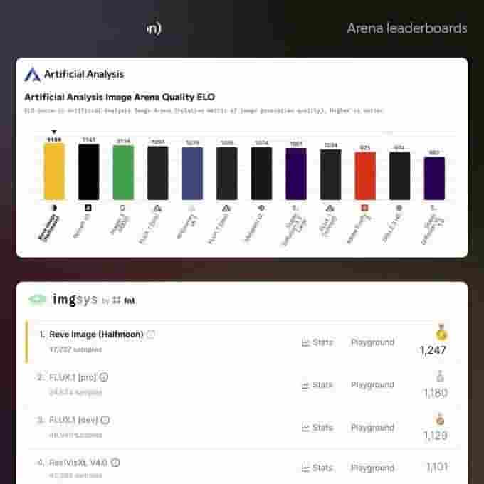在第三方平台Artificial Analysis的“图像生成质量”排行榜中,Reve Image 1.0更是击败了包括Google Imagen 3在内的众多对手,位列榜首。评测特别强调了其生成的图像中文字的清晰度,进一步证明了该工具在图像生成方面的卓越表现。以下是相关截图: