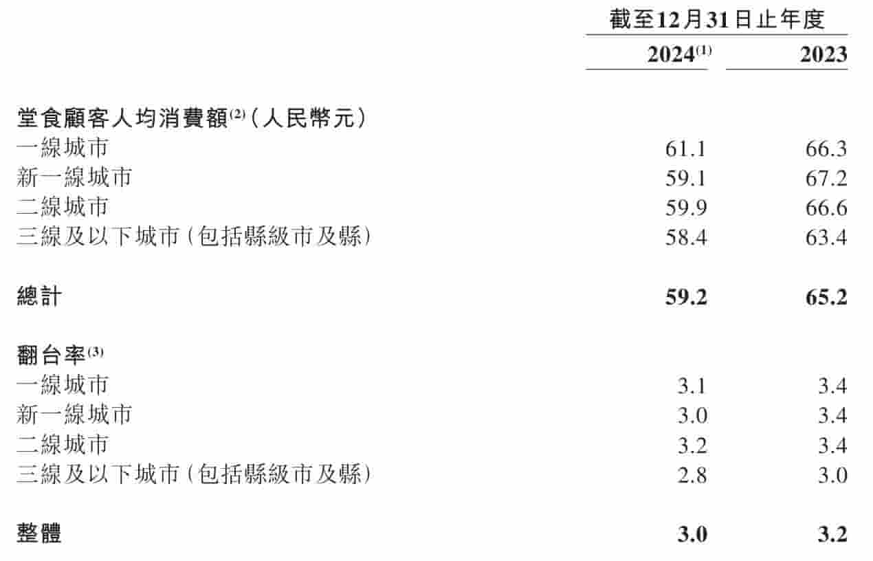 尽管堂食业务规模持续扩大,但人均消费额却有所下降。2024年,小菜园堂食客户的人均消费额为59.2元,较上一年度的65.2元有所降低。同时,同店翻台率保持在3次/天,显示出公司在提高餐桌周转率方面的稳定表现。然而,同店销售额却从上一年的39.27亿元下降至34.5亿元,降幅达到12.1%,这可能与市场竞争加剧以及消费者行为变化有关。