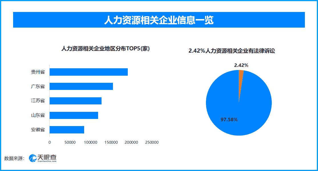 然而,值得注意的是,在从事人力资源相关业务的企业中,也有一部分面临着法律风险。据天眼查深度风险数据显示,约有2.42%的相关企业曾卷入法律诉讼。这提醒我们,在推动人力资源行业发展的同时,也需要加强监管和规范,确保行业的健康有序发展。