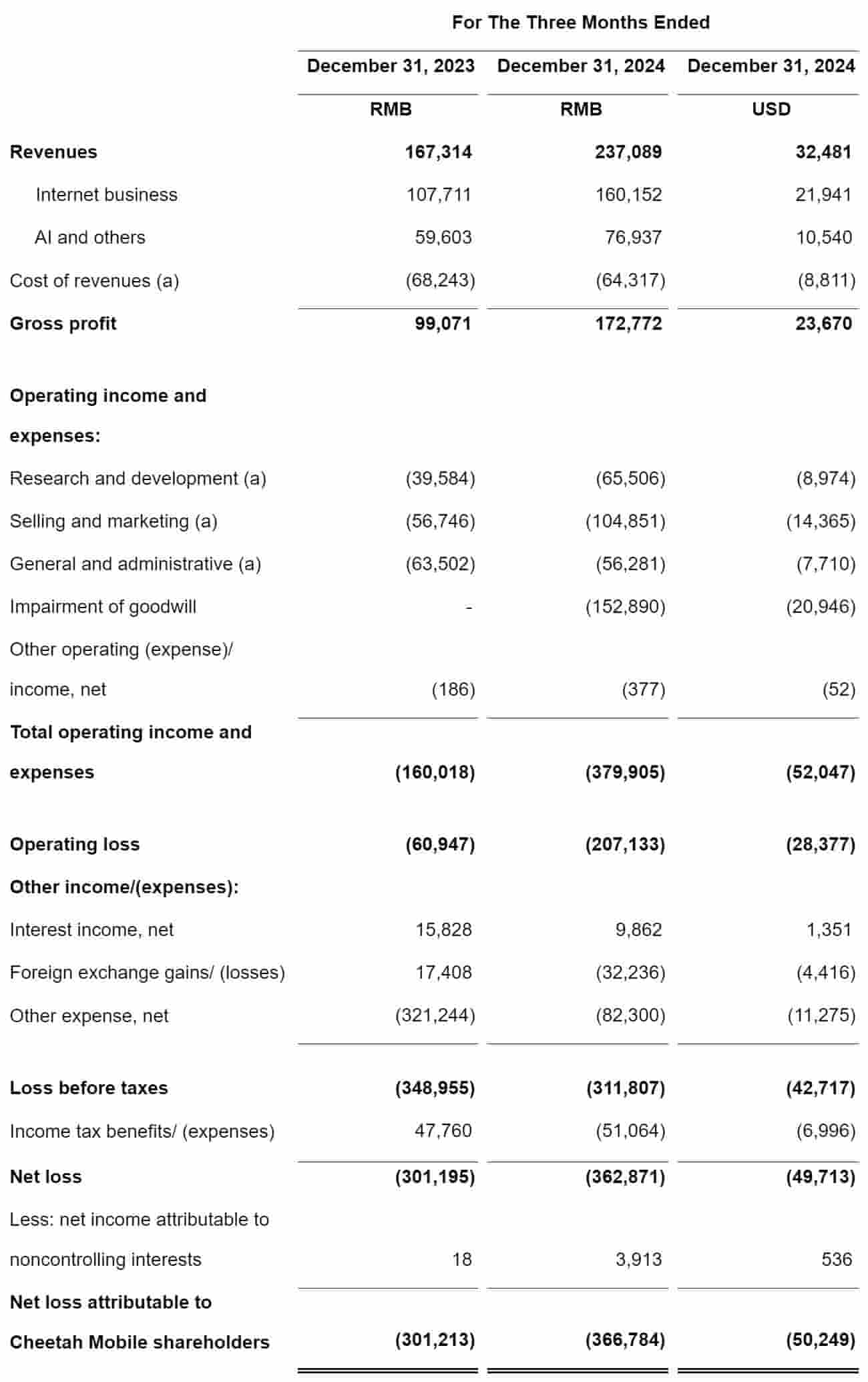 然而,在运营和净利润方面,猎豹移动仍面临一定挑战。2024年,公司的运营亏损为4.37亿元人民币(约5990万美元),而上年同期为2.1亿元;净亏损为6亿元人民币(约8242万美元),尽管与上年同期的5.94亿元相比变化不大,但仍显示出公司在盈利方面的压力。归属于公司股东的净亏损为6.18亿元人民币(约8460万美元),略高于上年同期的6.03亿元。