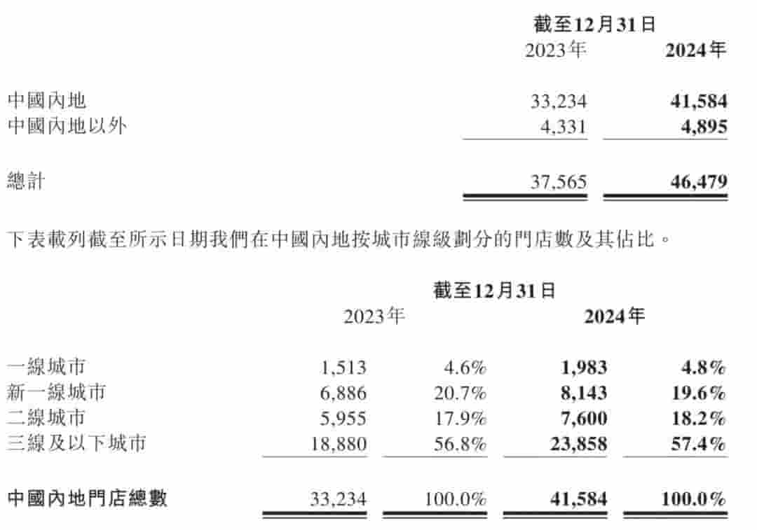 在门店布局方面,蜜雪冰城持续扩大其市场覆盖面。截至2024年底,该品牌在全球范围内已拥有46479家门店,其中,中国内地占据了41584家,海外市场则达到了4895家。值得注意的是,超过57.4%的门店位于中国的三线及以下城市,这体现了蜜雪冰城在下沉市场的深入布局。