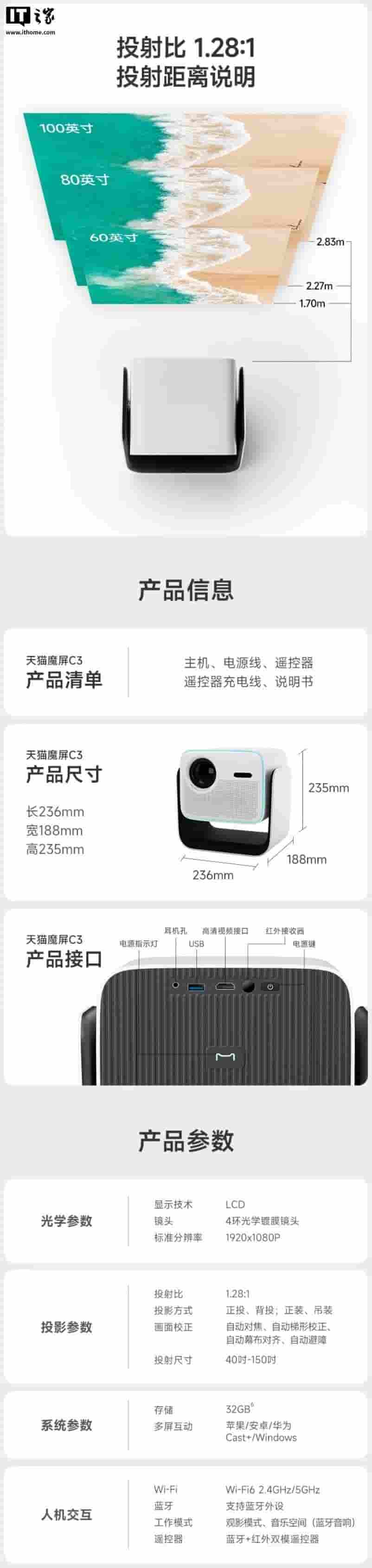 为了让用户更加直观地了解这款投影仪的性能参数,天猫魔屏C3还附带了详细的参数表。从表中可以看出,这款投影仪在亮度、对比度、分辨率等方面均表现出色,完全能够满足家庭娱乐的需求。