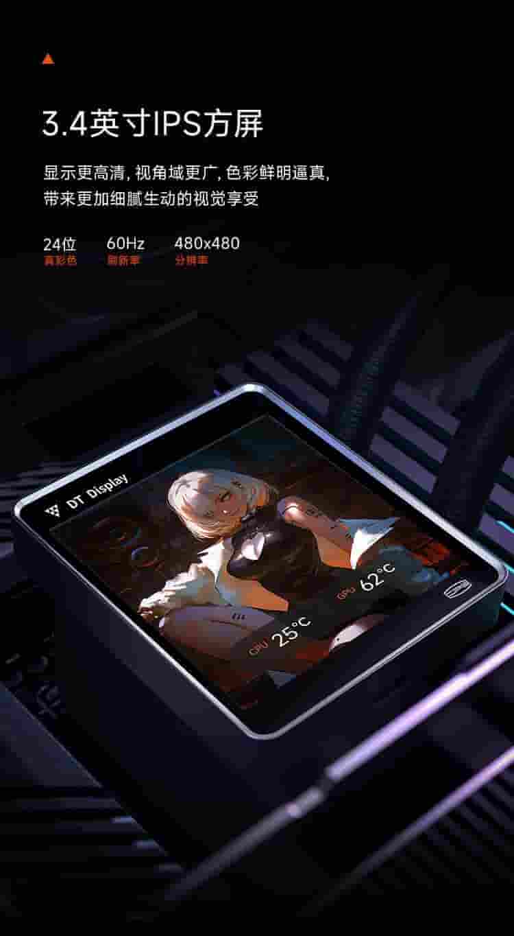 银翼 DT360 ARGB Display 的冷头部分采用了高品质的铝合金材料,经过CNC阳极氧化喷砂工艺处理,不仅外观精美,而且散热效果更佳。更引人注目的是,它配备了一个磁吸式可移动屏显模块,屏幕尺寸达到3.4英寸,分辨率为480×480,支持60Hz刷新率,能够显示24位真彩画面。用户还可以通过控制软件自定义显示内容,让散热器更加个性化。