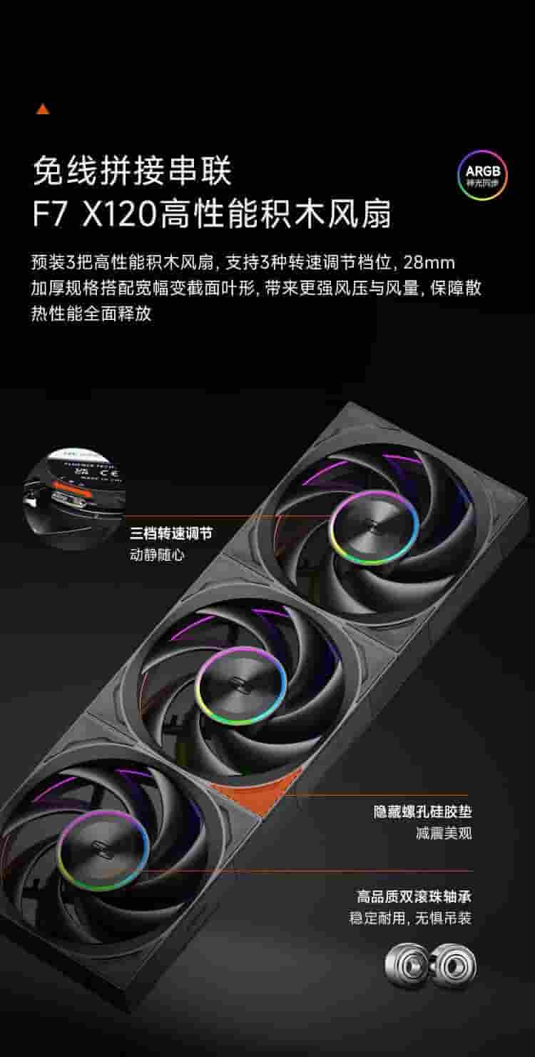 银翼 DT360 ARGB Display 还标配了三颗光翼 F7 X120 风扇。这些风扇采用了积木拼接和卡扣固定的免线串联结构,不仅安装方便,而且更加美观。风扇规格为12028加厚型,搭载了双滚珠轴承,支持三档转速调节(3000/2200/1500 RPM)。不同转速下的风力参数也经过了精心调校,确保在各种使用场景下都能提供合适的散热效果。