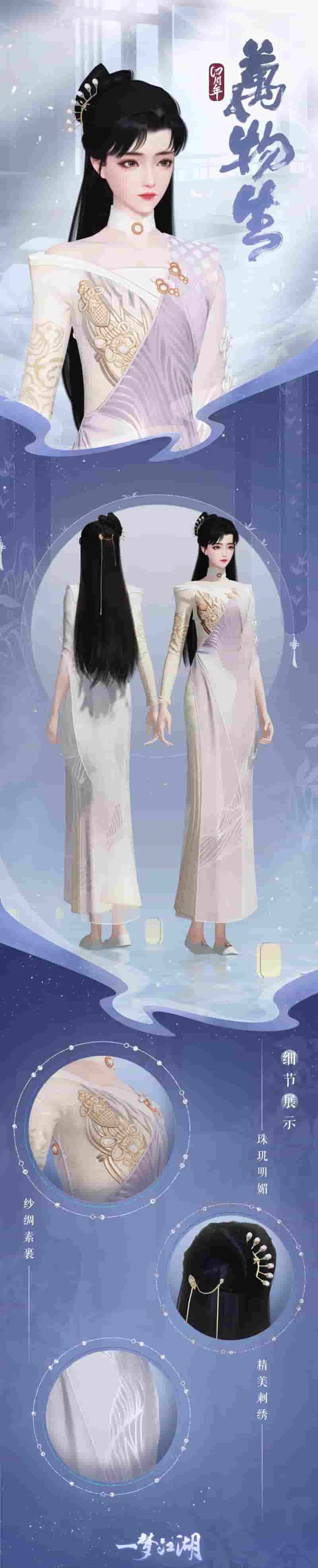 静言万物初,含气如聚沫。四载风雨同舟,如今江湖也将迎来全新的版本,处处都潜藏着无限的生机与活力。少侠,换上这套蕴天地间云雾水汽于裙袍间的时装·万物生,一同迎接我们的第四年吧!