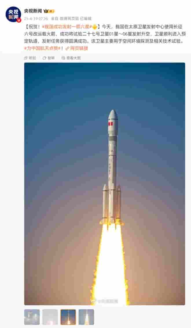 近日,我国航天领域再次传来振奋人心的消息。据官方报道,北京时间2025年4月19日清晨6时51分,太原卫星发射中心见证了一次重要的航天发射活动。长征六号改运载火箭不负众望,成功将试验二十七号卫星的01星至06星送入预定轨道,标志着此次发射任务取得了圆满的成功。