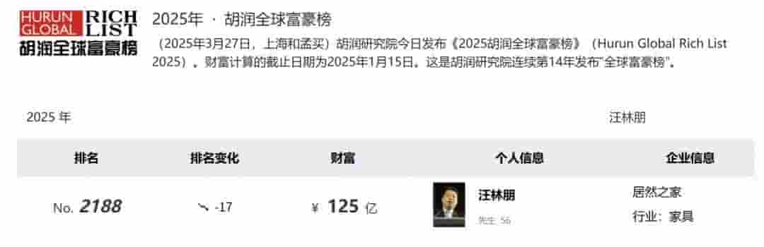 汪林朋,这位生于1968年的企业家,拥有丰富的商业背景。自2001年起,他曾任北京居然之家投资控股集团有限公司总裁,直至2020年12月。自2015年起,他担任该公司董事长,并在2019年12月至2020年12月期间,兼任居然智家的董事长。汪林朋还曾登上2025年胡润全球富豪榜,以125亿人民币的身价位列第2188位。