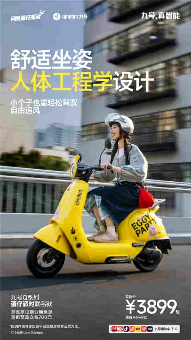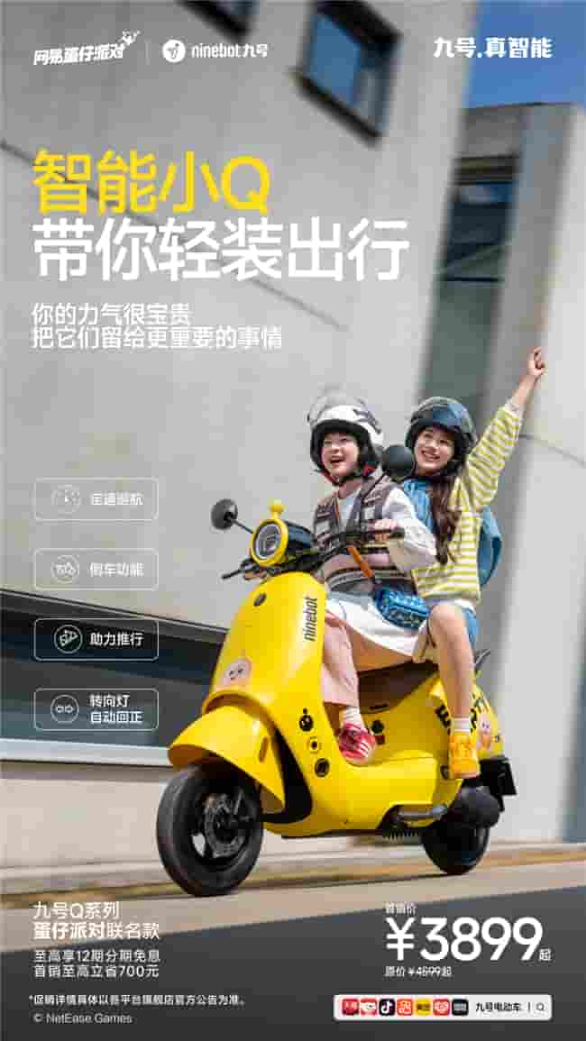 九号公司旗下创新短途出行品牌Ninebot九号携手国民级休闲游戏《蛋仔派对》,共同推出的九号Q系列联名款电动车,终于正式开卖啦。此次联名围绕“萌趣出行”打造,将游戏元素深度融合至骑行体验中。
