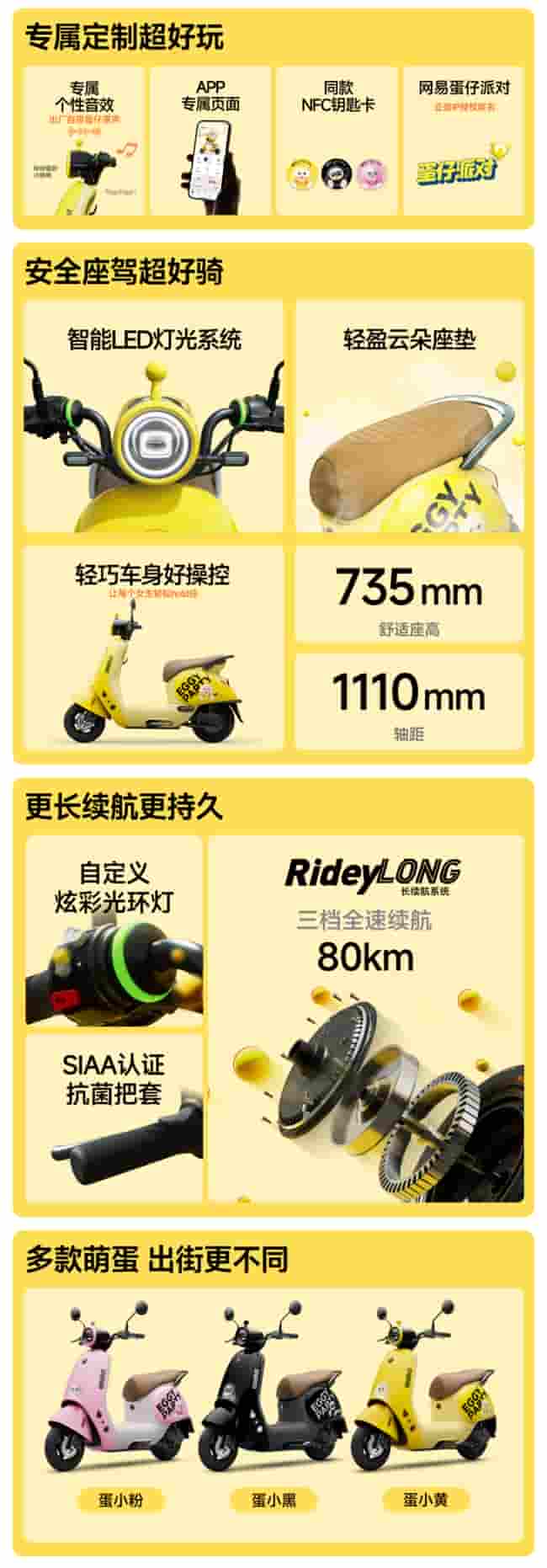此次联名款推出“蛋小粉”“蛋小黑”“蛋小黄”三款潮流配色,灵感源自《蛋仔派对》经典角色形象。车身采用渐变喷涂工艺,并融入蛋仔IP定制贴花,从轮毂到后视镜,每一处细节都充满游戏元素,完美契合年轻用户的个性化审美。