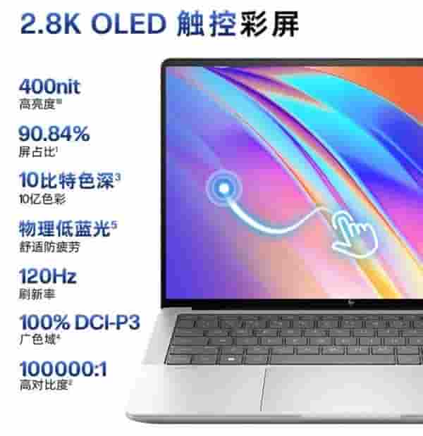 在外观设计上,惠普战X Pro锐龙版同样令人眼前一亮。冰川白的配色与圆润的边角设计,尽显简约美学。A面的简洁设计与“薯条”LOGO相得益彰,既保留了商务属性又不失时尚感。C面三侧边缘的圆枕设计,使得握感更加舒适。14英寸的2.8K OLED触摸屏,拥有120Hz高刷新率和90.84%的高屏占比,以及100% DCI-P3广色域,无论是处理文档还是观看视频,都能呈现出细腻、生动的画面效果。