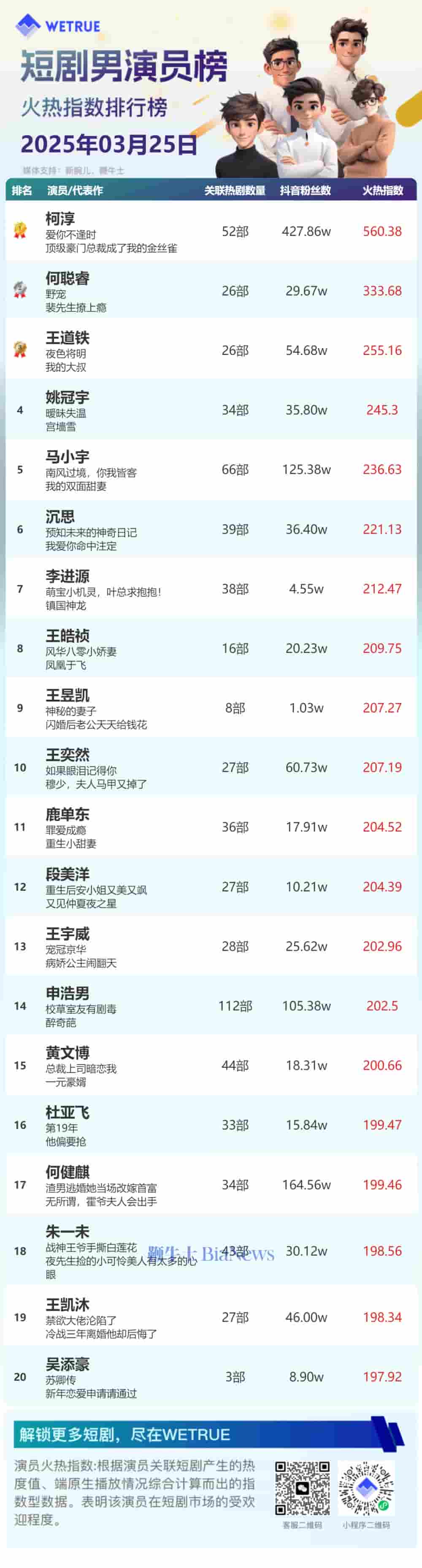 3月25日短剧演员火热指数出炉:孙艺燃、柯淳登顶男女演员榜!