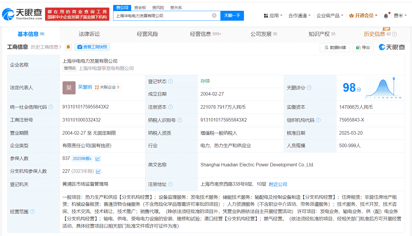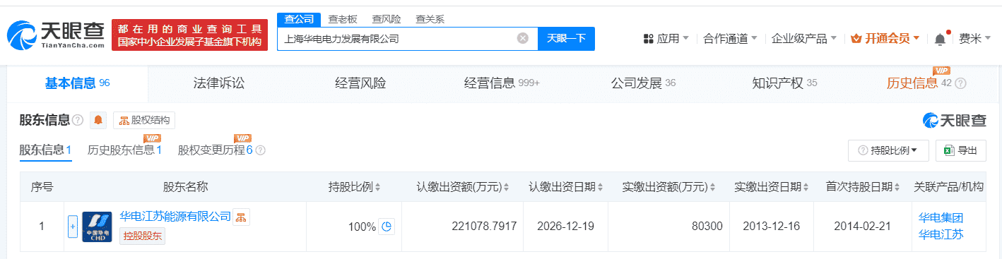 值得注意的是,上海华电电力发展有限公司的背后站着强大的华电集团。据天眼查进一步揭示,该公司由华电集团旗下华电江苏能源有限公司全资控股,这一背景无疑为其在电力行业的发展提供了坚实的支撑。
