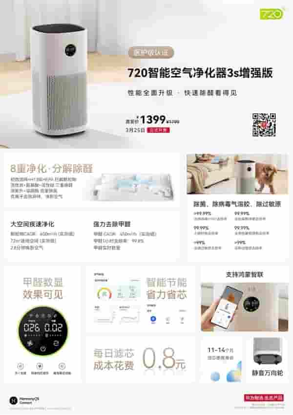 华为智选近期推出了720智能空气净化器3s增强版,这款产品在首发期间以1399元的优惠价格面市,相比原价1799元,为消费者带来了不小的实惠。