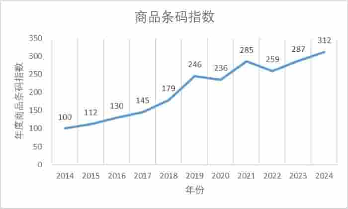 近期,中国物品编码中心公布了一项重要数据,揭示了2024年中国商品条码指数(CBI)的最新动态。数据显示,CBI指数在这一年跃升到了312点,整体呈现出鲜明的上升趋势。