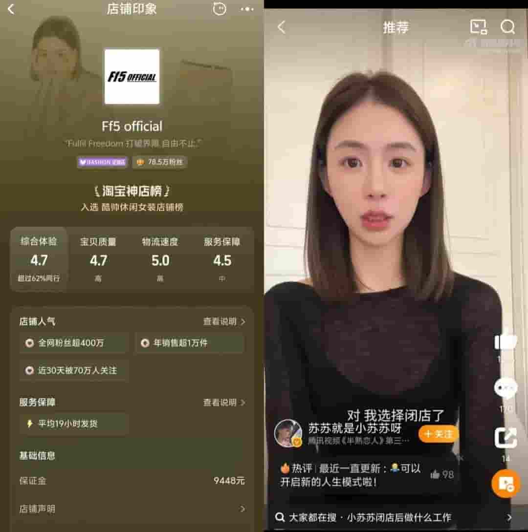 以“Ff5 official”为例,其主理人“苏苏SUSU”曾是《半熟恋人》第三季嘉宾,拥有超1500万粉丝。然而,在淘宝店铺的运营过程中,她也经历了销量下降、内耗严重的困境。尽管尝试了多种努力,包括转品牌、带货等,但最终还是因为“活不下去”而无奈告别淘宝。同样,“李大米Lidami”和“MAKI STUDIO”等店铺也面临着类似的困境。