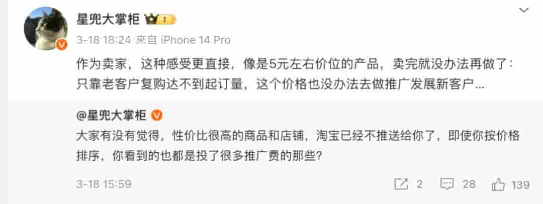业内人士分析认为,中小商家的囧境与淘天新政有一定关系。今年2月下旬,淘天方面召开了一场KO内部会,优化流量分配、确保流量精准流向优质商家成为重点目标之一。然而,对于“优质商家”的定义并不明确,导致中小商家在平台上的地位更加边缘化。即便花了更多广告成本,也很难得到流量扶持。