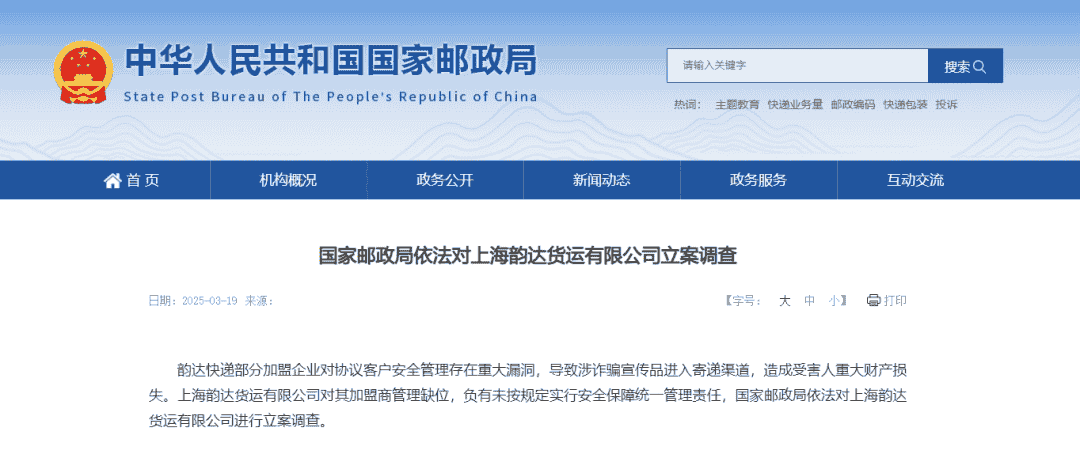 针对这一系列事件,国家邮政局迅速采取行动,依法对上海韵达货运有限公司进行立案调查。国家邮政局指出,韵达快递部分加盟企业在协议客户安全管理上存在重大漏洞,导致涉诈骗宣传品得以进入寄递渠道,严重侵害了消费者合法权益。同时,韵达总部对加盟商的管理也存在明显缺位,未按规定实行安全保障统一管理。
