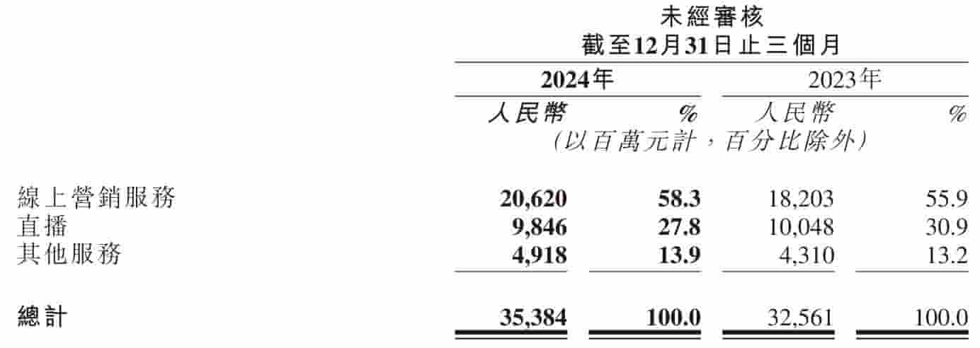 尽管收入有所下滑,但快手的其他服务收入却实现了显著增长。第四季度,其他服务收入为49.18亿元,同比增长了14.1%。这一增长使得其他服务收入在总营收中的占比从上年同期的13.2%提升至13.9%。