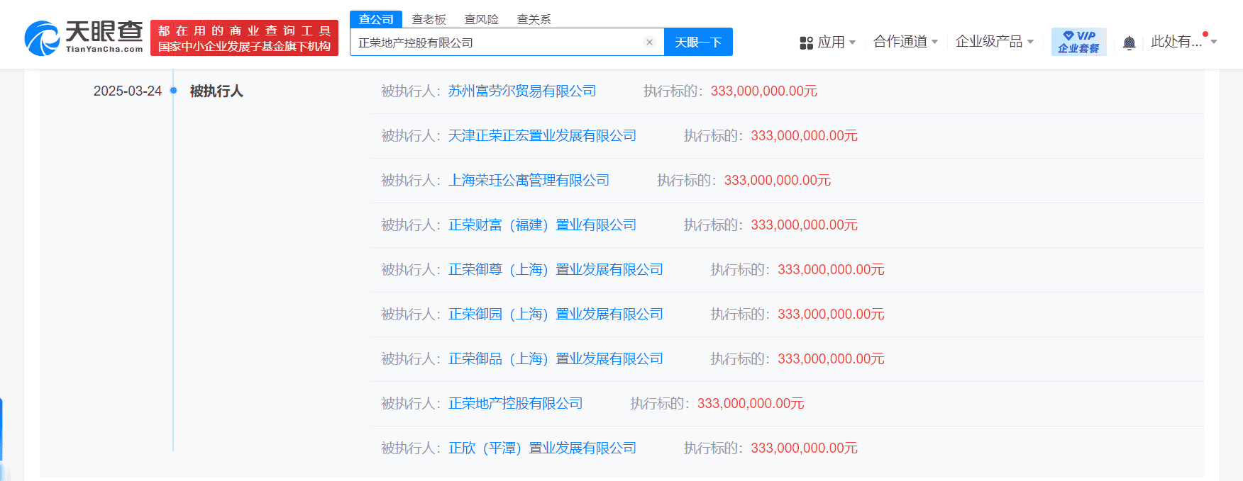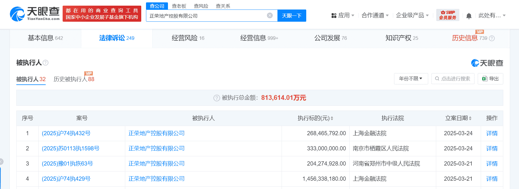 近期,正荣地产控股有限公司在法律诉讼方面遭遇了一系列挑战。据天眼查信息显示,从3月21日至3月24日短短几天内,该公司新增了四条被执行人记录,涉及的总金额高达22.62亿元。这些案件涵盖了公司债券交易纠纷和金融借款合同纠纷等多个方面,显示出正荣地产在财务和法律层面上面临的压力。