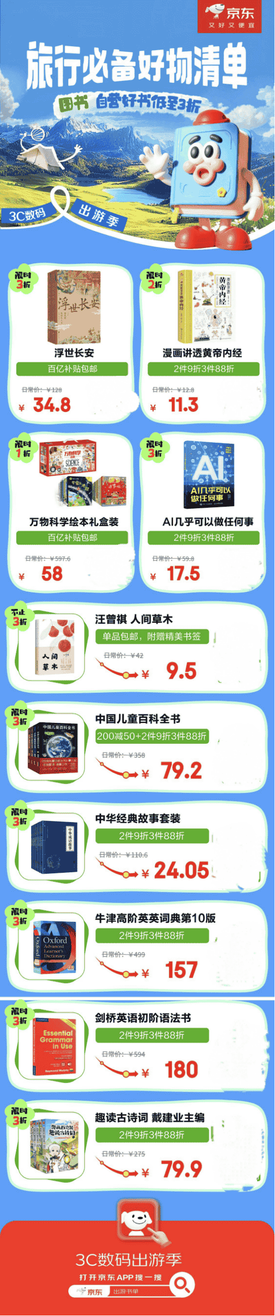 此次活动自启动以来,一直持续到4月13日,读者只需登录京东APP,搜索关键词“出游书单”,即可进入活动专区,挑选心仪的书籍。京东图书精心准备了涵盖人文地理、文学经典、自然科普、学习提升等多个领域的图书,为读者带来了包括自营好书低至3折、跨店满减、百亿补贴包邮等多重优惠。3月25日还有限量满200减50的惊喜券限时发放,让读者在享受阅读乐趣的同时,也能获得实实在在的优惠。