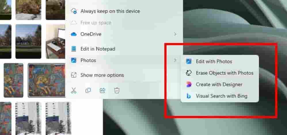在文件资源管理器中,右键点击图片后,Windows 11用户将看到一个更加智能的右键菜单。菜单中包含了“用照片编辑”、“AI擦除物体”、“Designer创意设计”以及“Bing视觉搜索”等多个实用选项,这些功能的加入极大地提高了用户的操作效率。