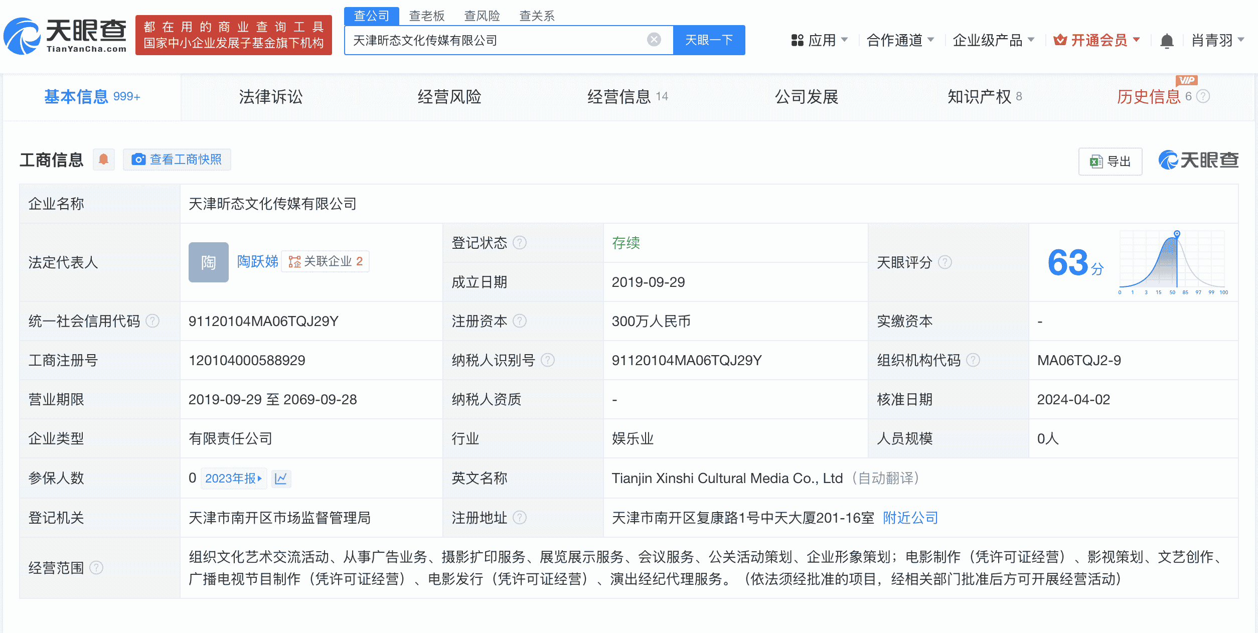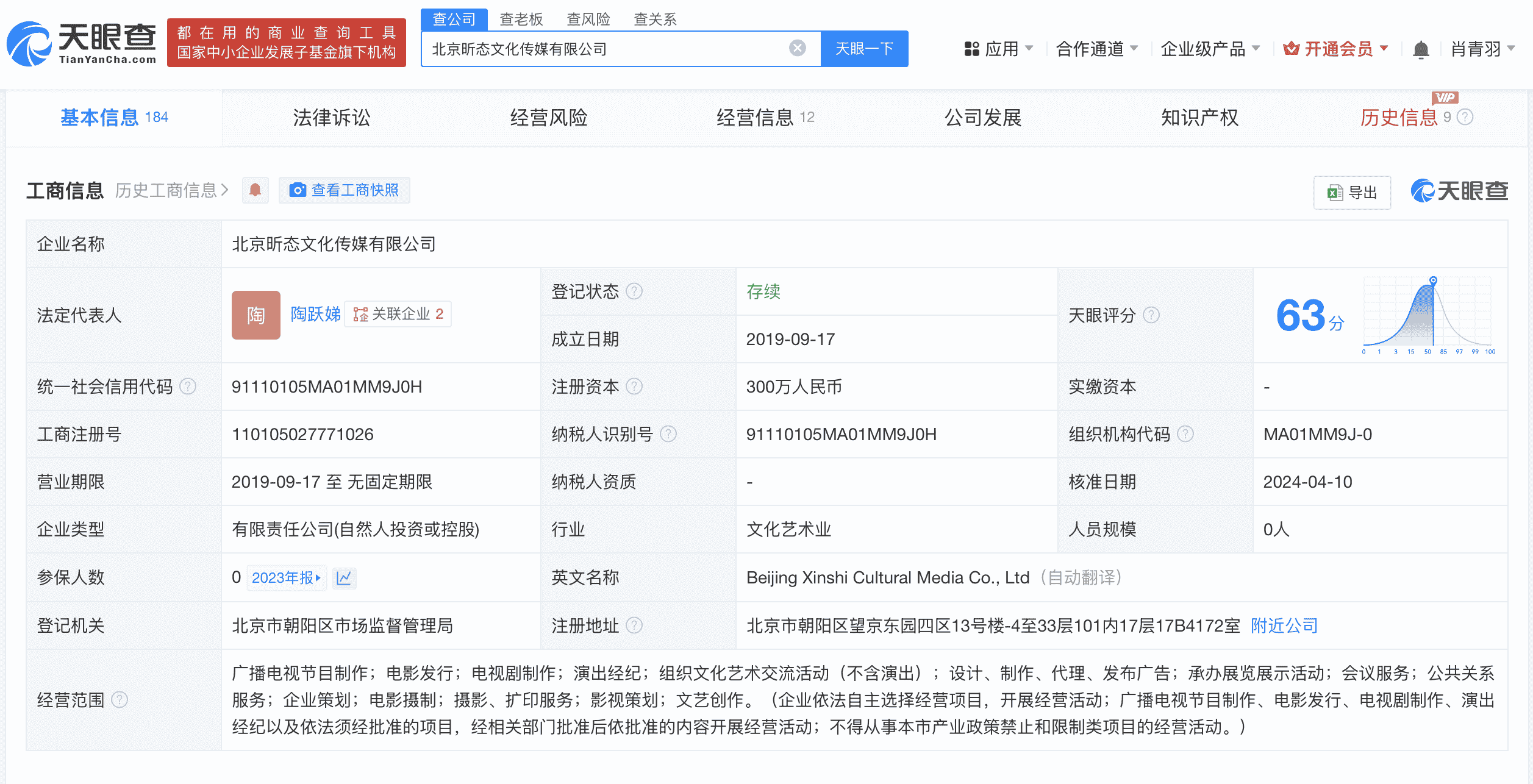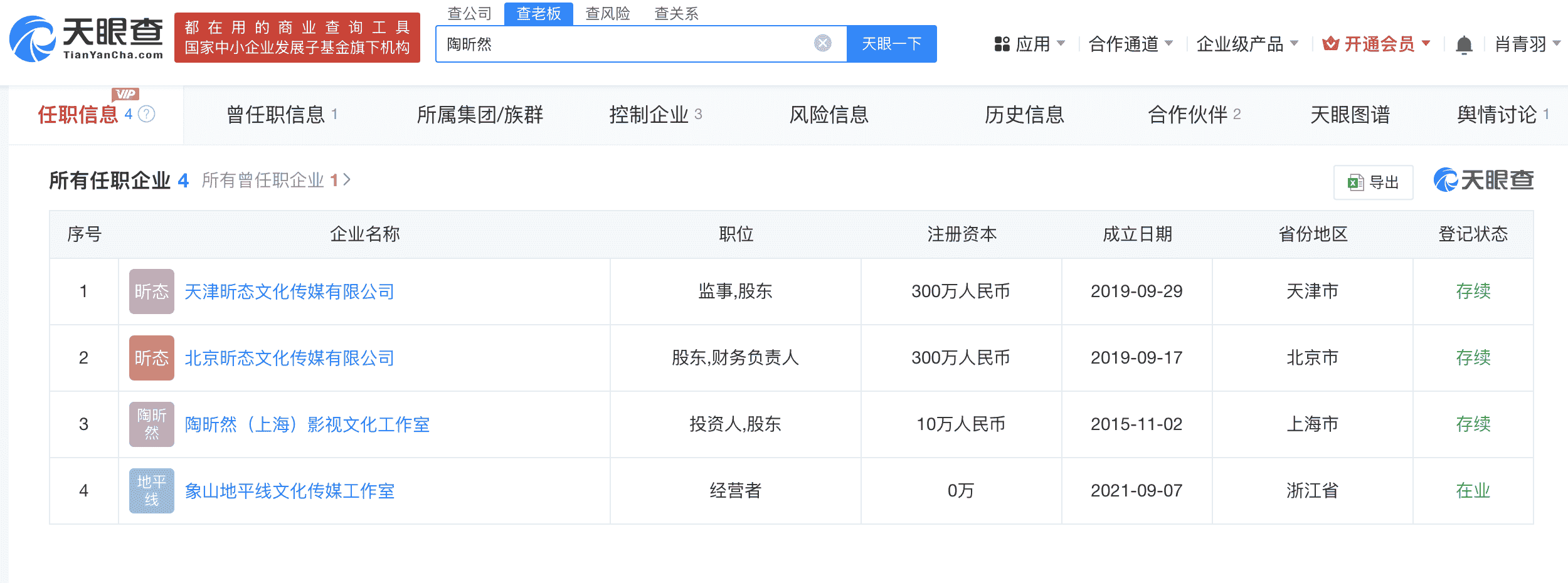 据天眼查信息显示,陶昕然在商业领域亦有所布局,名下共关联有四家企业,且目前均处于正常运营状态。这些企业包括天津昕态文化传媒有限公司、北京昕态文化传媒有限公司、以及陶昕然(上海)影视文化工作室等,显示了她在演艺事业之外,亦有着不俗的商业头脑和投资眼光。
